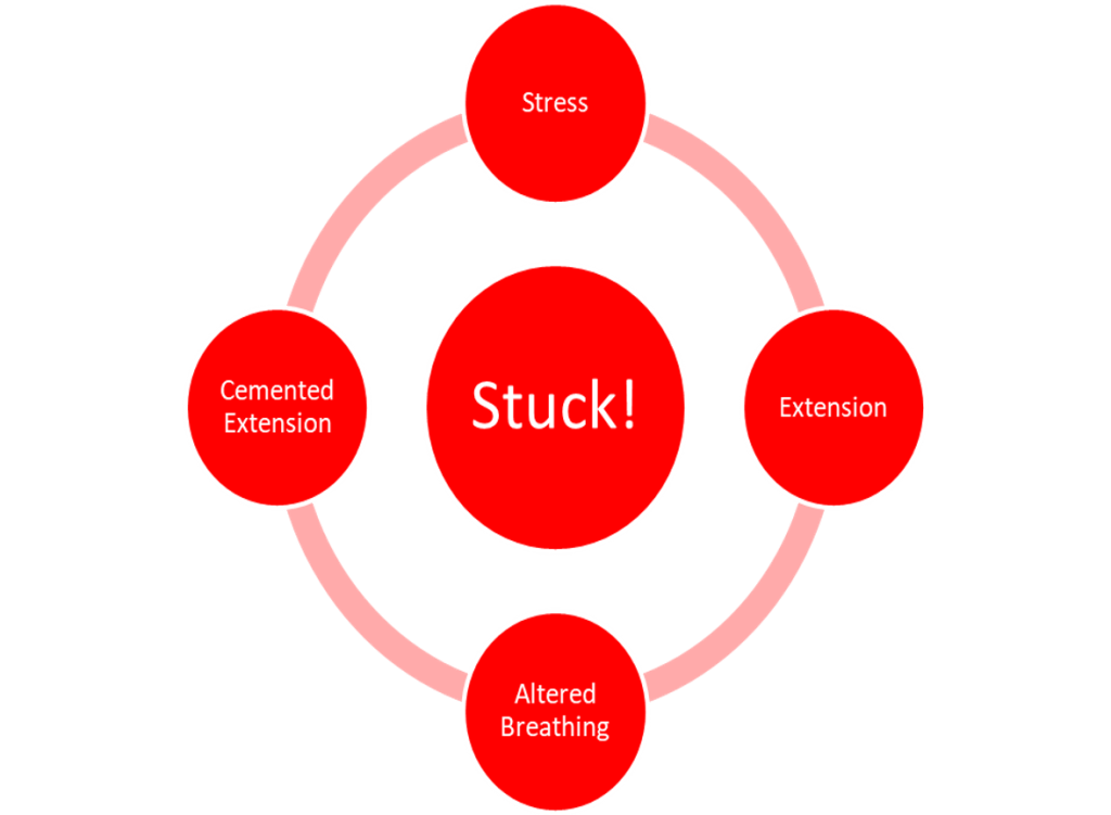 Think of it this way, stress drives us into an extended position. The change from effective to compensatory breathing locks us and keeps us there. We breathe in excess of 20 thousand times a day and if you have being pulled into a position where your lower and upper back muscles become short and tight and are now being asked to work as breathing muscles, there is no way you are going to be able to come out of that posture until you remove the stress and find a strategy to get back to normal breathing mechanics!