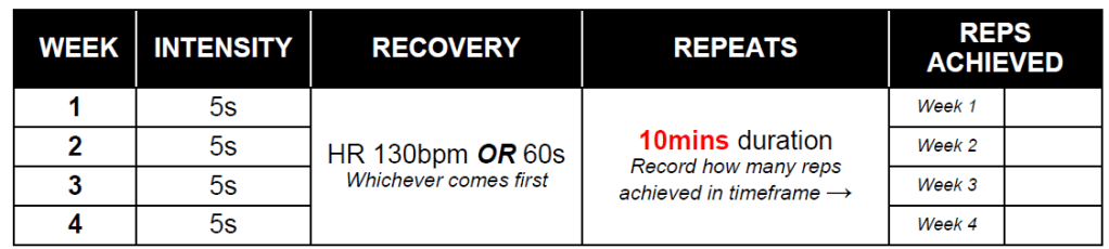 As each week progresses, the idea is to increase the duration of each working repetition whilst reducing the duration of the rest periods. Secondly, its common to increase the amount of sets performed too. This ensures that your fast twitch fibres are challenged to improve their aerobic capabilities and power output whilst your slow twitch fibres are challenged to adapt better at recovery from high intensity efforts.