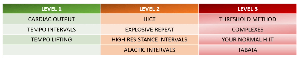 So this is how we are going to do it, we are going to list the best conditioning methods. We are then going to categorize them into levels. The levels are dictated by the amount of stress each method places on the body as well as the effect that each method has on the body. More on this shortly but let’s look at the methods again: