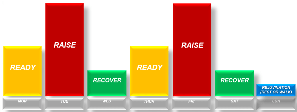 Due to the amount of stress that “Red Days” place on you means that you need a period of reduced stress whilst your body adapts. This is where your “Green Days” come in. These days are formed from mostly slower, lower intensity methods that focus on laying your performance foundations (slow twitch fibres and heart size). They also have a powerful effect on your nervous system by switching it into recovery mode. This allows you to “Recover” and get ready to repeat the whole process! Ready – Raise – Recover!
